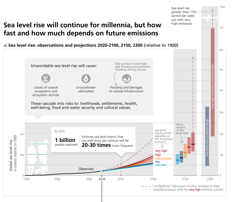 Sea level rise under different emission scenarios and timescales. IPCC 2023 Longer Report, Figure 3.4, p80.