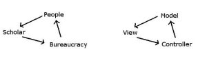 The relationship of the developer to her users via code is that of the scholar official to the people via the bureaucracy. It is also isomorphic to the GUI model view controller pattern.
